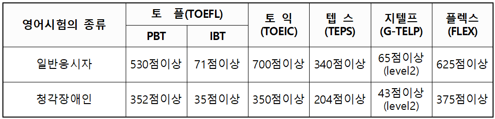 또한, 차량이나 신체 손해사정사가 재물손해사정사 2차 시험에 응시하는 경우에도 아래 표에 해당하는 영어시험 성적을 제출해야 합니다.
