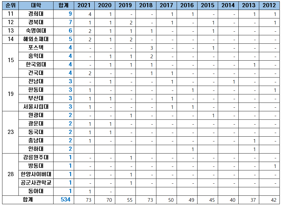 11위는 9명을 배출한 경희대, 12위는 7명을 배출한 경북대, 13위는 6명을 배출한 숙명여대입니다.