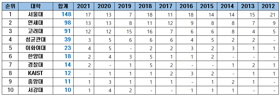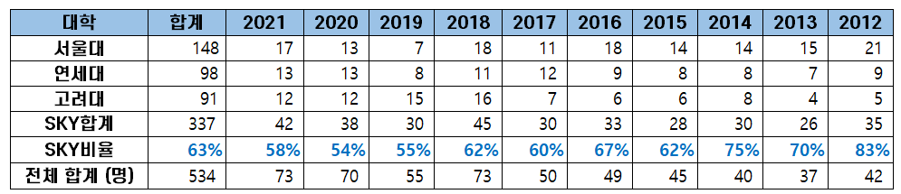 2012년부터 2021년까지 임용된 검사의 출신 대학 현황은 아래 표와 같습니다.