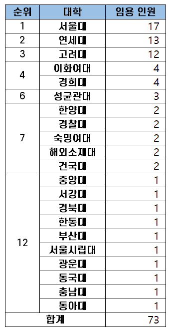 포스텍, 홍익대, 한국외대, 건국대에서는 각 4명의 검사가 임용되었고, 전남대, 한동대, 부산대, 서울시립대에서는 각 3명, 원광대, 광운대, 동국대, 충남대, 인하대에서는 각 2명, 강릉원주대, 방통대, 한양사이버대, 공군사관학교, 동아대에서는 각 1명이 검사에 임용되었습니다.