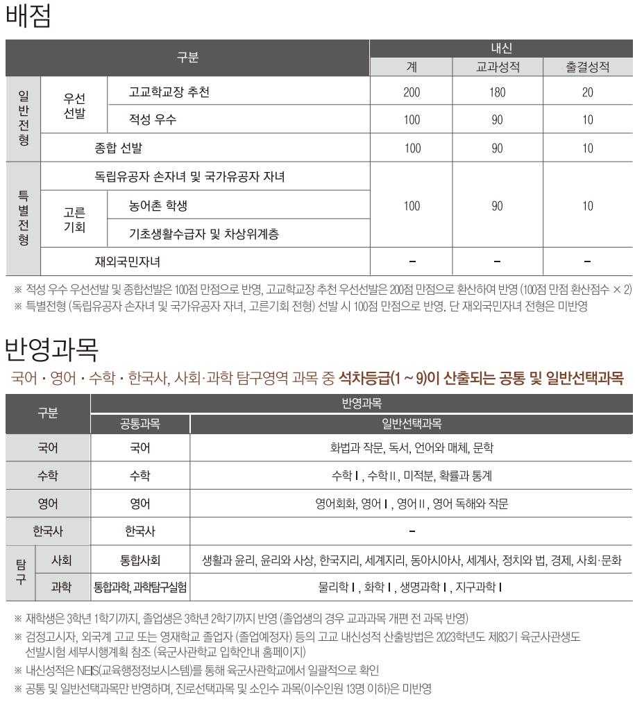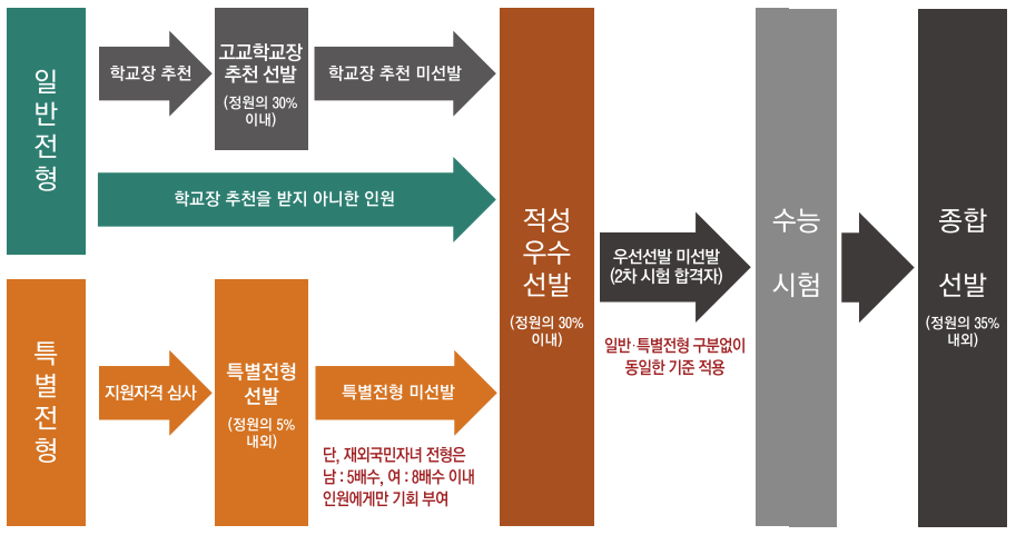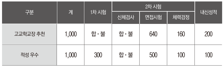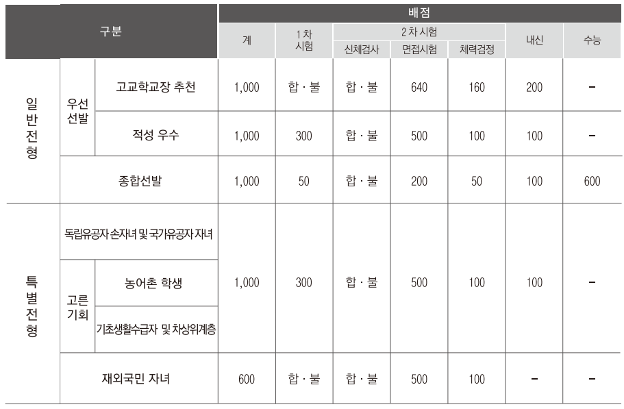 1차 필기시험, 2차 신체검사·면접시험·체력검정, 내신 및 수능 성적의 입학전형 별 배점은 아래 표와 같습니다. 일반전형 중 우선선발과 특별 전형은 수능 성적을 포함하지 않고 내신만 반영해 최종 합격자를 결정하며, 종합선발만 수능 성적을 반영합니다.