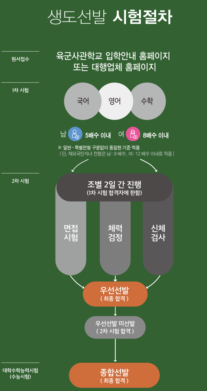 육군사관생도는 1차 필기시험, 2차 신체검사·체력검정·면접시험을 거친 후 대학수학능력시험 성적과 1차 및 2차 시험 성적 등을 종합하여 최종 합격자를 결정합니다.