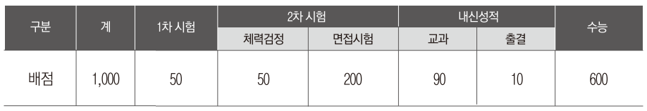 2차 시험 합격자 중 성별, 계열별, 선발 유형별 총점 순에 의해 최종 합격자를 선발하는데요. 선발 유형별 배점은 아래 표와 같습니다.