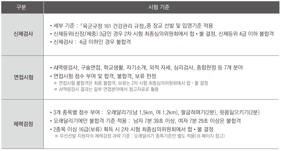 육군사관학교 1차 시험 합격자를 대상으로 하는 2차 신체검사, 체력검정, 면접시험의 합격 기준은 아래 표와 같습니다.