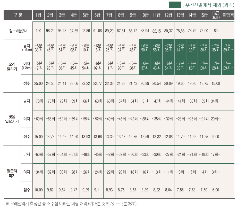 - 체력검정 전 종목 만점자에게는 총점에서 가산점 1점을 부여합니다.