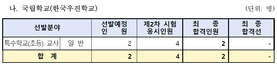 광주광역시 교육청에서 선발하는 유치원・초등학교・특수학교(유치원・초등) 임용고시 2차 시험 최종 합격자는 6명입니다.