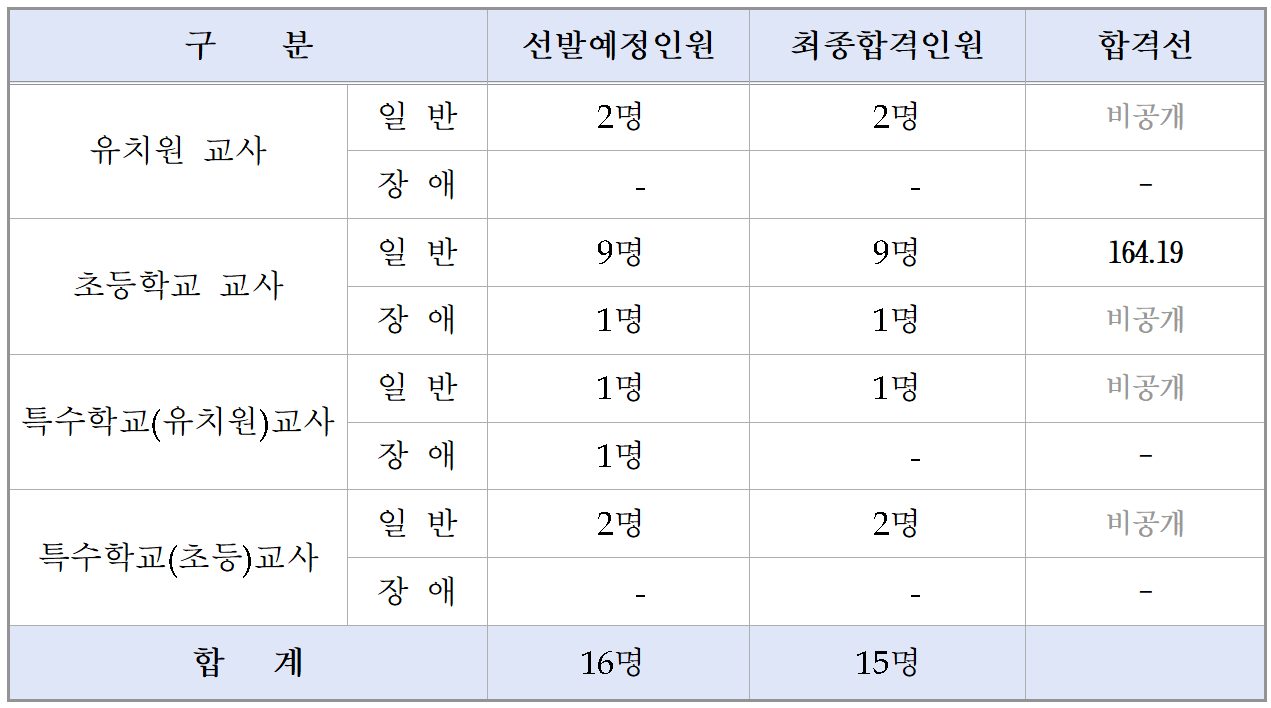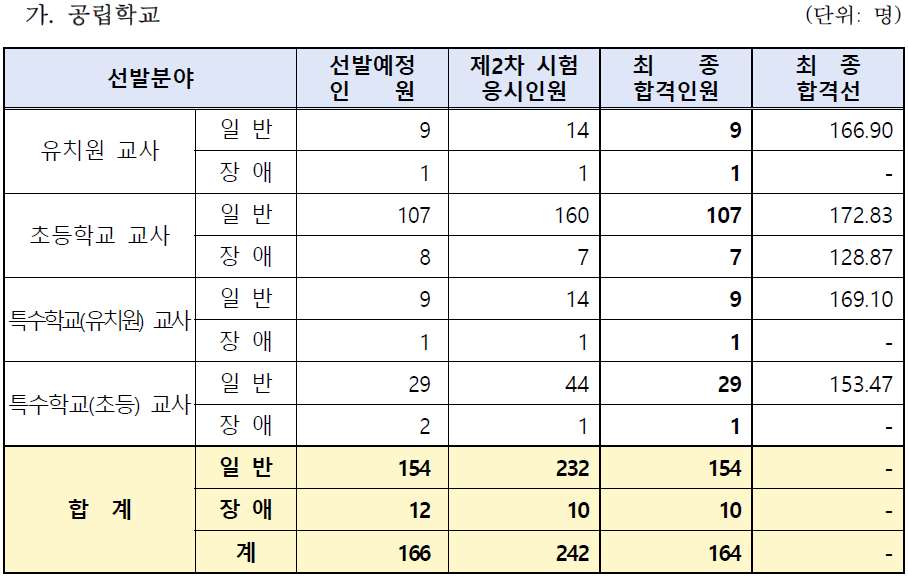 서울특별시 교육청에서 선발하는 2023학년도 유치원・초등학교・특수학교(유치원・초등)임용고시 2차 시험 최종 합격자는 공립학교 164명, 국립학교 2명입니다.