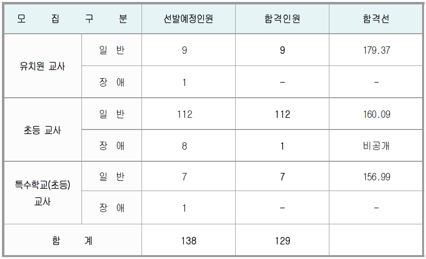 유치원 교사 커트라인은 179.37점, 초등학교 교사 커트라인은 160.09점, 특수학교(초등) 교사 커트라인은 156.99점입니다.
