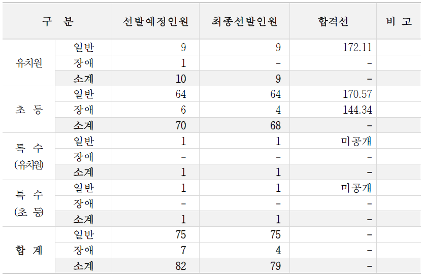 유치원 교사 커트라인은 169.47점, 초등학교 교사 커트라인은 177.15점, 특수학교(유치원) 교사 커트라인은 150.60점, 특수학교(초등) 교사 커트라인은 147.20점입니다.