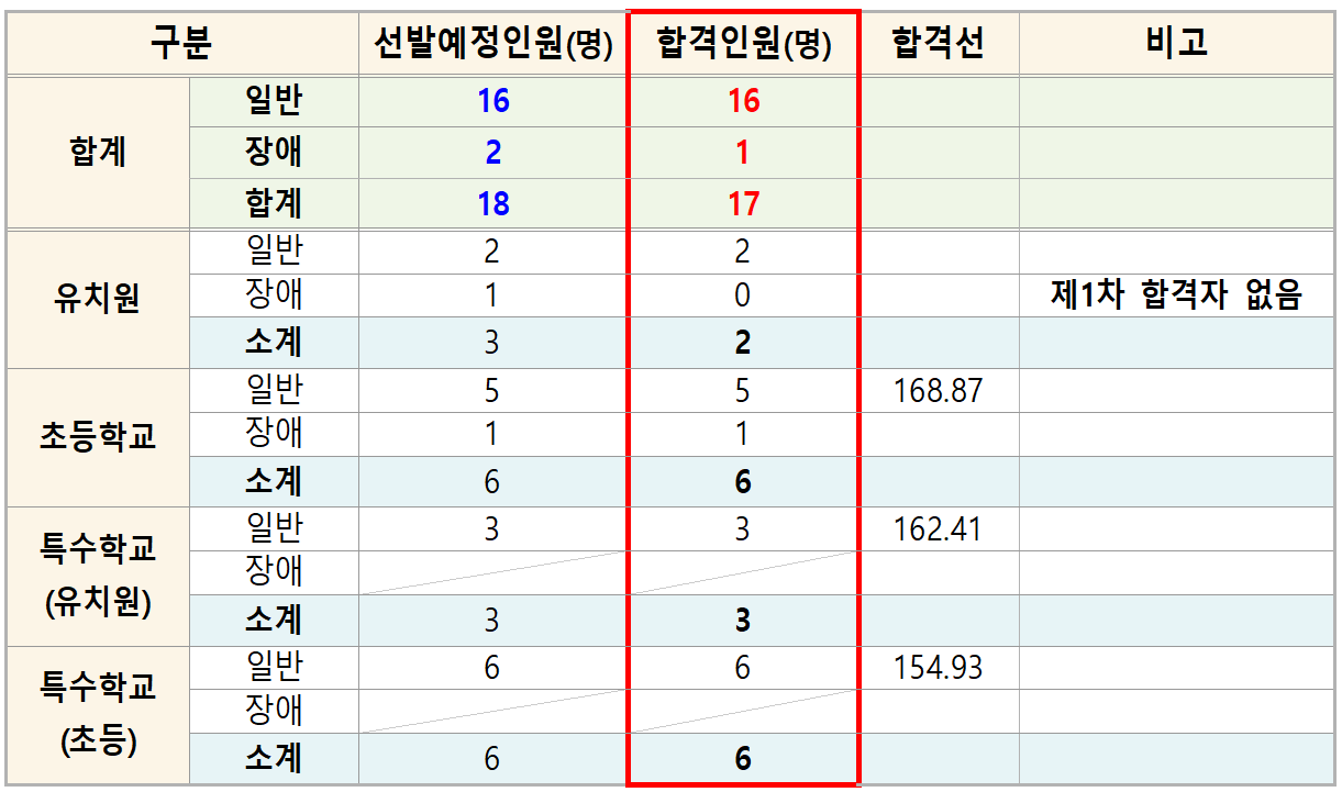 초등학교 교사 커트라인은 168.87점, 특수학교(유치원) 교사 커트라인은 162.41점, 특수학교(초등) 교사 커트라인은 154.93점입니다.