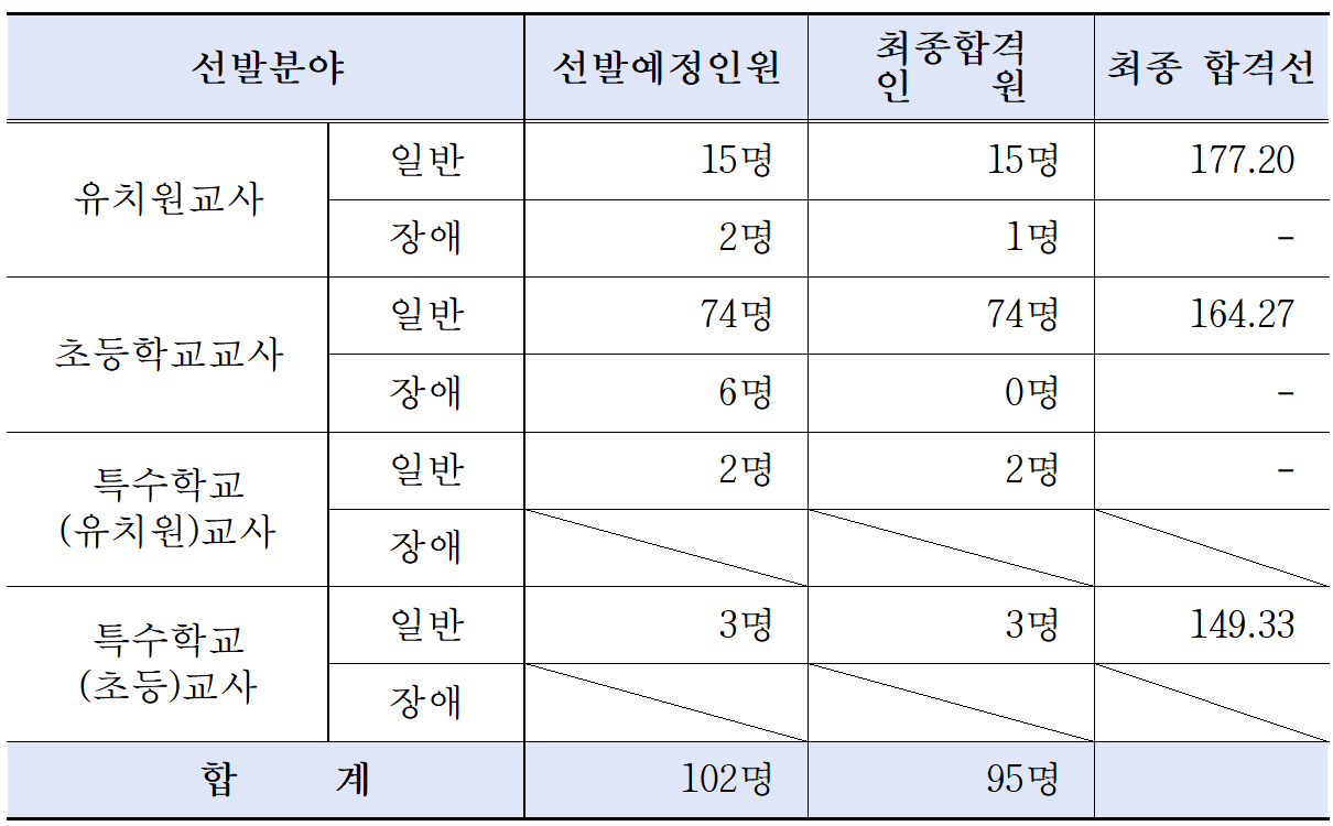 충청북도 교육청에서 선발하는 유치원・초등학교・특수학교(유치원・초등)임용고시 2차 시험 최종 합격자는 95명입니다.