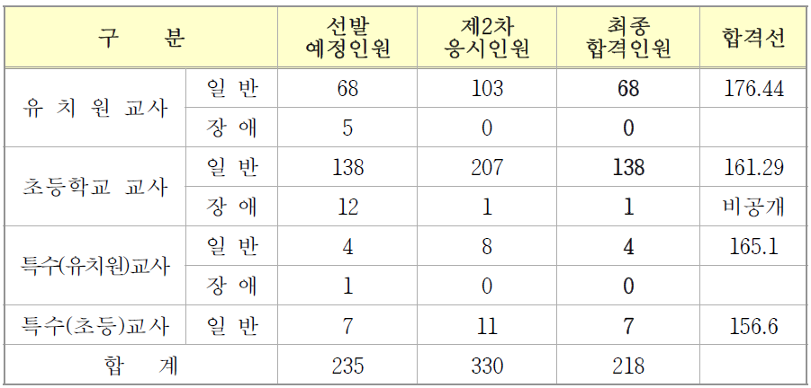 경상남도 교육청에서 선발하는 유치원・초등학교・특수학교(유치원・초등)임용고시 2차 시험 최종 합격자는 218명입니다.