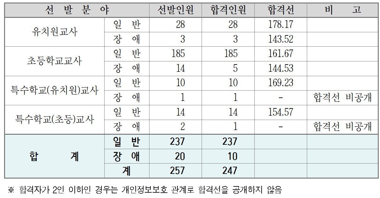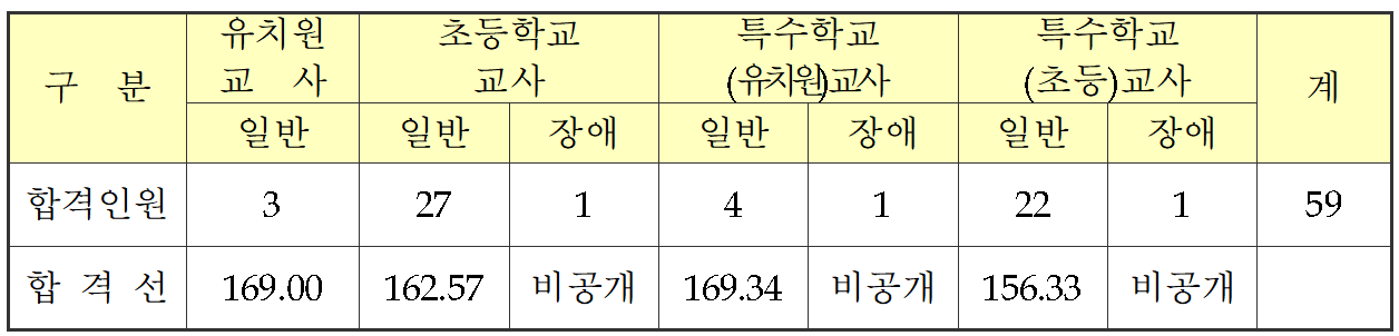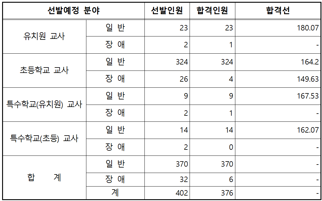 공립 유치원 교사 커트라인은 175.33점, 초등학교 교사 커트라인은161.56점, 특수학교(유치원) 교사 커트라인은 166.67점, 특수학교(초등) 교사 커트라인은 152.27점입니다.
