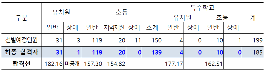 유치원 교사 커트라인은 182.16점, 초등학교 교사 일반모집 커트라인은 157.30점, 초등학교 교사 지역제한모집 커트라인은 154.82점, 특수학교(유치원) 커트라인은 177.17점, 특수학교(초등) 교사 커트라인은 162.51점입니다.