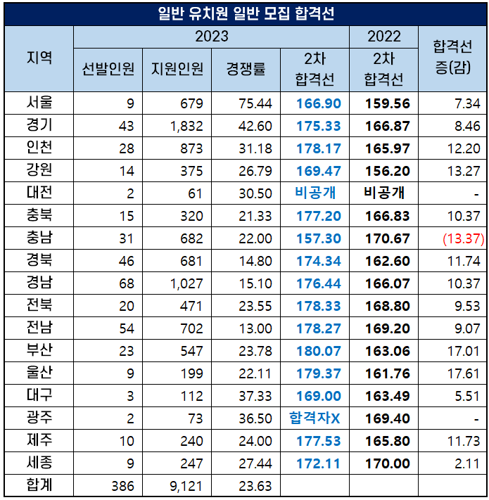 2023년 유치원 임용고시 2차 최종 합격선은 충청남도를 제외한 나머지 시·도 교육청이 지난해보다 상승했는데요.부산시 유치원 교사 2차 시험 커트라인이 180.07점으로 가장 높았고, 충청남도가 157.30점으로 가장 낮았습니다.