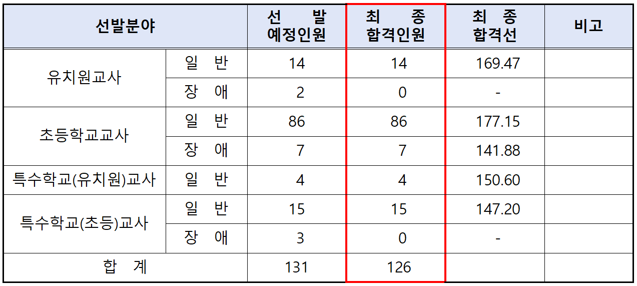 강원도 교육청에서 선발하는 유치원・초등학교・특수학교(유치원・초등)임용고시 2차 시험 최종 합격자는 126명입니다.