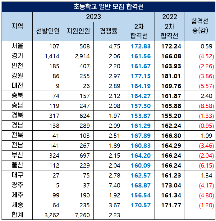 2023년 초등 임용고시 2차 시험 최종 합격자 현황(일반 모집)을 살펴보면 서울시 교육청 커트라인이 172.83점으로 가장 높았고, 제주도가 156.54점으로 가장 낮았습니다.