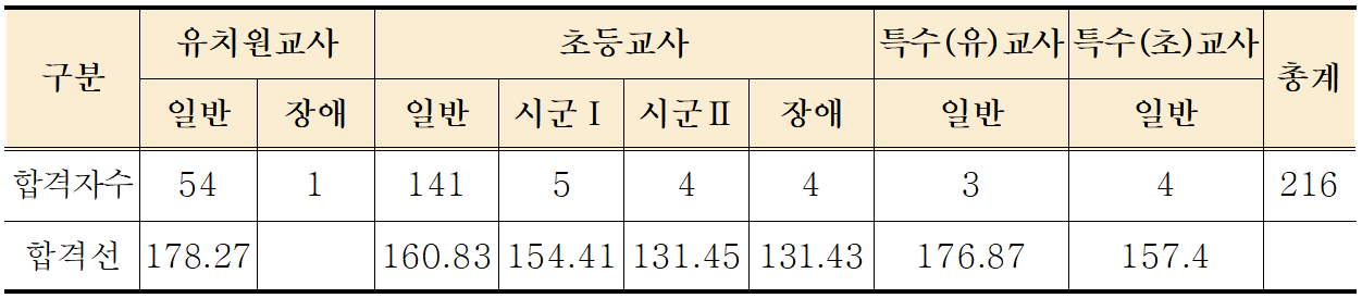 전라남도 교육청에서 선발하는 유치원・초등학교・특수학교(유치원・초등)임용고시 2차 시험 최종 합격자는 공립 216명입니다.