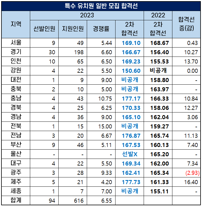 2023년 특수학교(유치원) 임용고시 2차 시험 최종 합격자 현황(일반 모집)을 살펴보면 제주도의 커트라인이 177.73점으로 가장 높았고, 강원도가 150.60점으로 가장 낮았습니다.