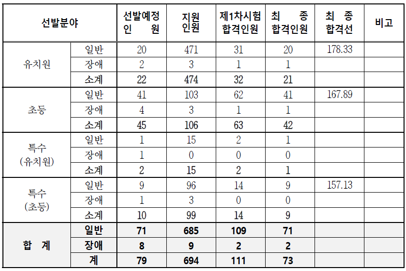 유치원 교사 커트라인은 178.33점, 초등학교 교사 커트라인은 167.89점, 특수학교(초등) 교사 커트라인은 157.13점입니다.