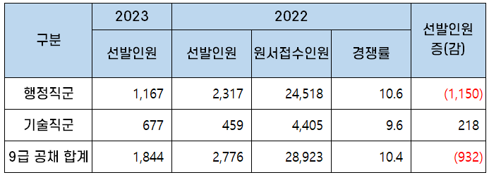 2023년 서울시는 공개경쟁채용시험으로 1,844명의 9급 공무원을 신규채용하는데요. 2,776명을 선발한 2022년보다 9급 공무원 티오가 932명이 감소했습니다.