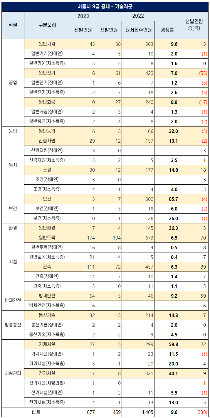 2023년 서울시 9급 공무원 기술직군의 직렬 및 구분 모집 단위별 선발예정인원은 아래 표와 같은데요.