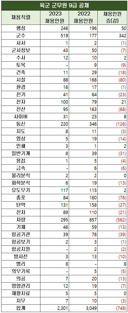 2021년에 4,672명을, 2022년에 4,462명의 군무원을 신규 채용한 것과 비교하면 2023년 모집 인원이 크게 감소했습니다.