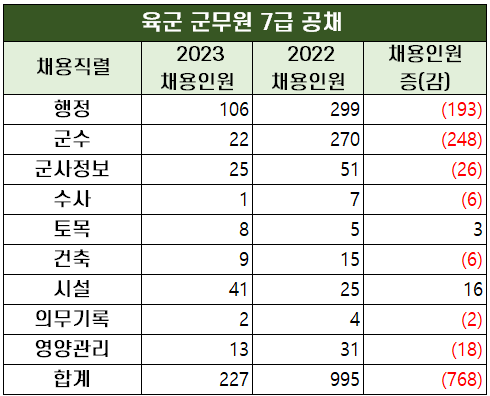 2023년 육군 군무원 7급 공채는 9개 직렬에서 227명을 채용합니다. 지난 2022년에 27개 직렬에서 995명을 채용했던 것에 비하면 모집 인원이 768명이나 감소했습니다.