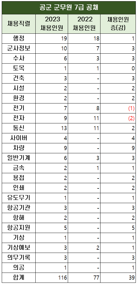 지난해에는 채용하지 않았던 건축직, 시설직, 환경직, 사이버직, 차량직, 용접직, 인쇄직, 유도무기직, 항공기관직, 항해직, 항공지원직, 기상직, 의무기록직, 의공직도 2023년에는 신규 채용을 진행해 7급 공군 군무원 채용인원이 전년보다 큰 폭으로 증가했습니다.