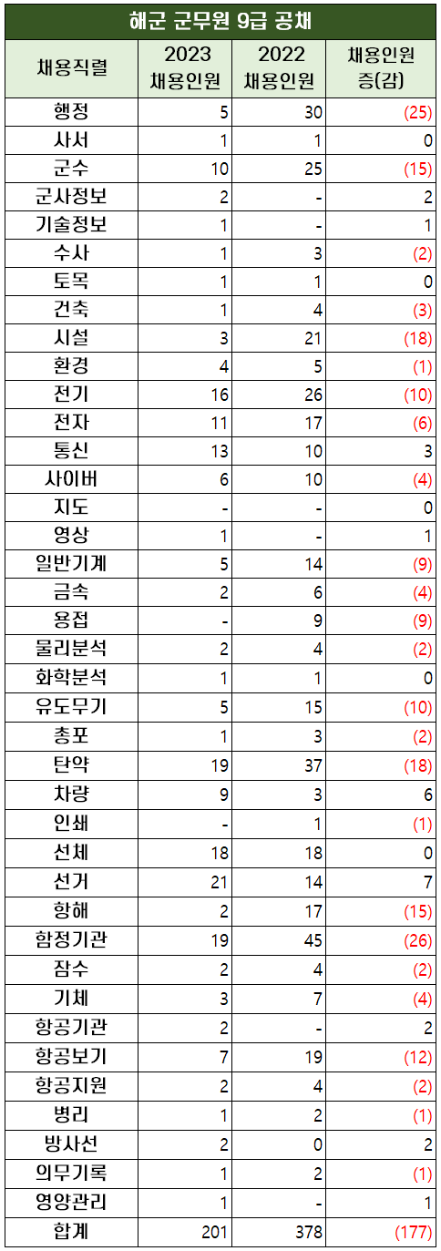 2023년 해군 군무원 9급 공채는 36개 직렬에서 201명을 채용합니다. 지난 2022년에 32개 직렬에서 378명을 채용했던 것에 비하면 모집 인원이 177명 감소했습니다.