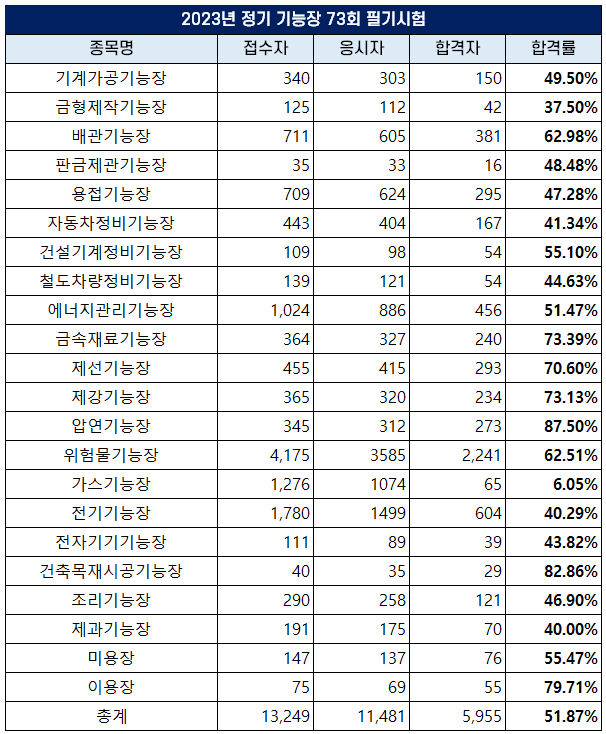 2023년 정기 기능장 제73회 필기시험 종목별 합격률 및 채점 결과