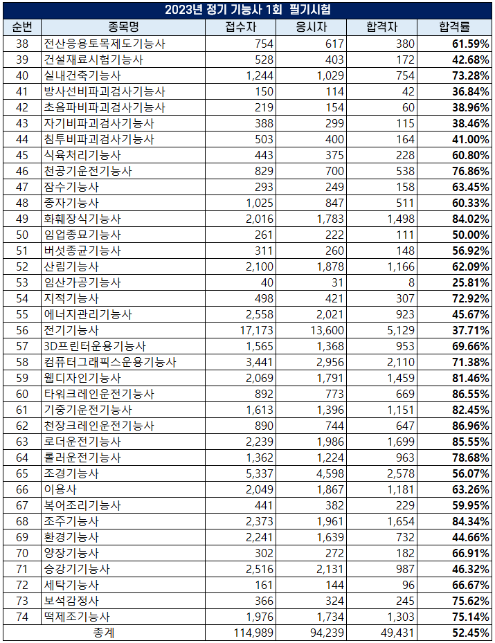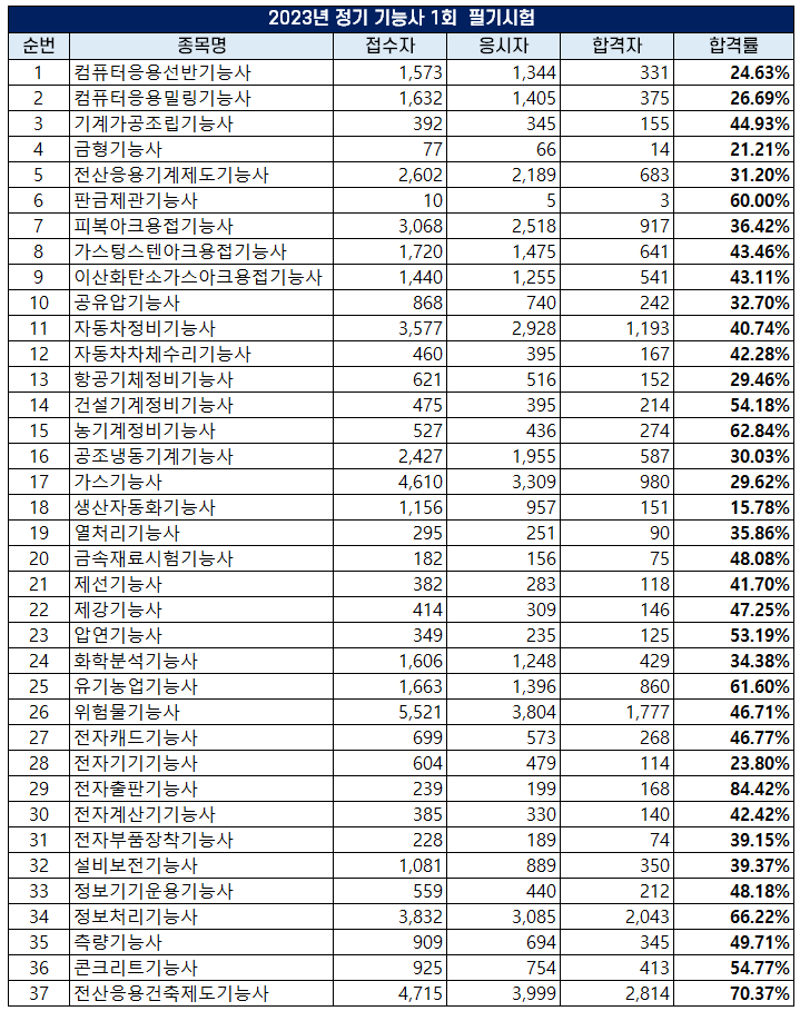 2023년 정기 기능사 제1회 필기시험 합격률 및 채점 결과
