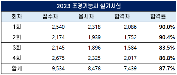 2023년 1회 조경기능사 실기시험에는 2,540명이 응시원서를 접수했는데요. 이 중 2,318명이 시험에 응시해 2,086명이 합격했고, 합격률은 90.0%를 기록했습니다.