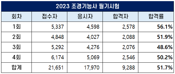 4회 조경기능사 필기 힙격률은 50.2%이고, 2023년 평균 합격률은 51.7%입니다.