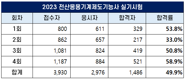 4회 전산응용기계제도기능사 필기 힙격률은 31.3%이고, 2023년 평균 합격률은 30.8%입니다.