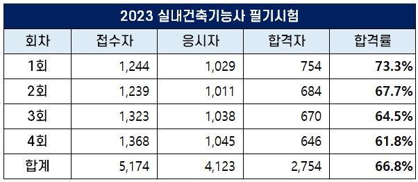 2023년 1회 실내건축기능사 필기시험에는 1,244명이 응시원서를 접수했는데요. 이 중 1,029명이 시험에 응시해 754명이 합격했고, 합격률은 73.3%를 기록했습니다.