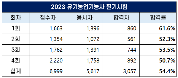 4회 유기농업기능사 필기 힙격률은 50.7%이고, 2023년 평균 합격률은 54.4%입니다.