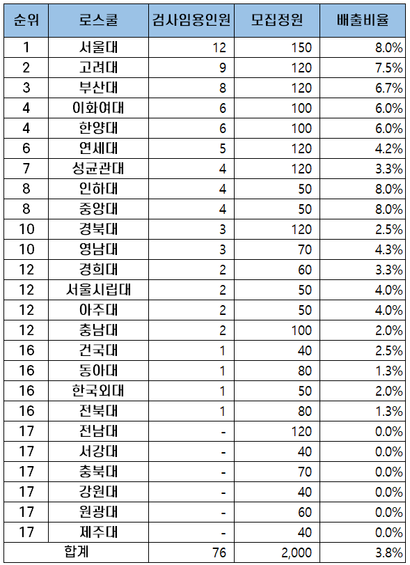 | 순위 | 로스쿨 | 검사임용인원 |