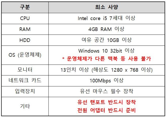 CBT에 사용되는 노트북은 법무부가 동일 사양으로 일괄하여 설치하고, 응시자는 다른 전자기기를 사용할 수 없습니다. 참고로 변호사시험 모의시험에서 사용되는 노트북 최소 사양은 아래 표와 같으니, 변호사시험을 준비하는 수험생은 참고하세요.