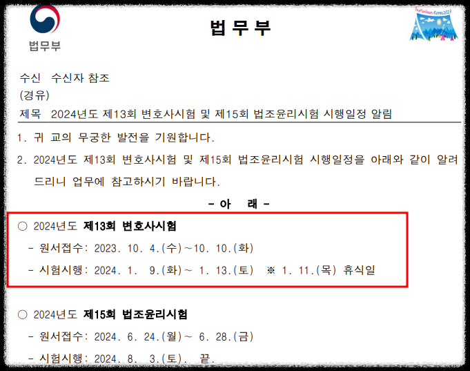 법무부가 2024년 제13회 변호사시험 일정을 확정해 전국 25개 로스쿨 앞으로 공문을 보냈습니다. 2023년 9월 1일에 공고한 2024년도 변호사시험 실시계획 공고문은 하단에 첨부했습니다.