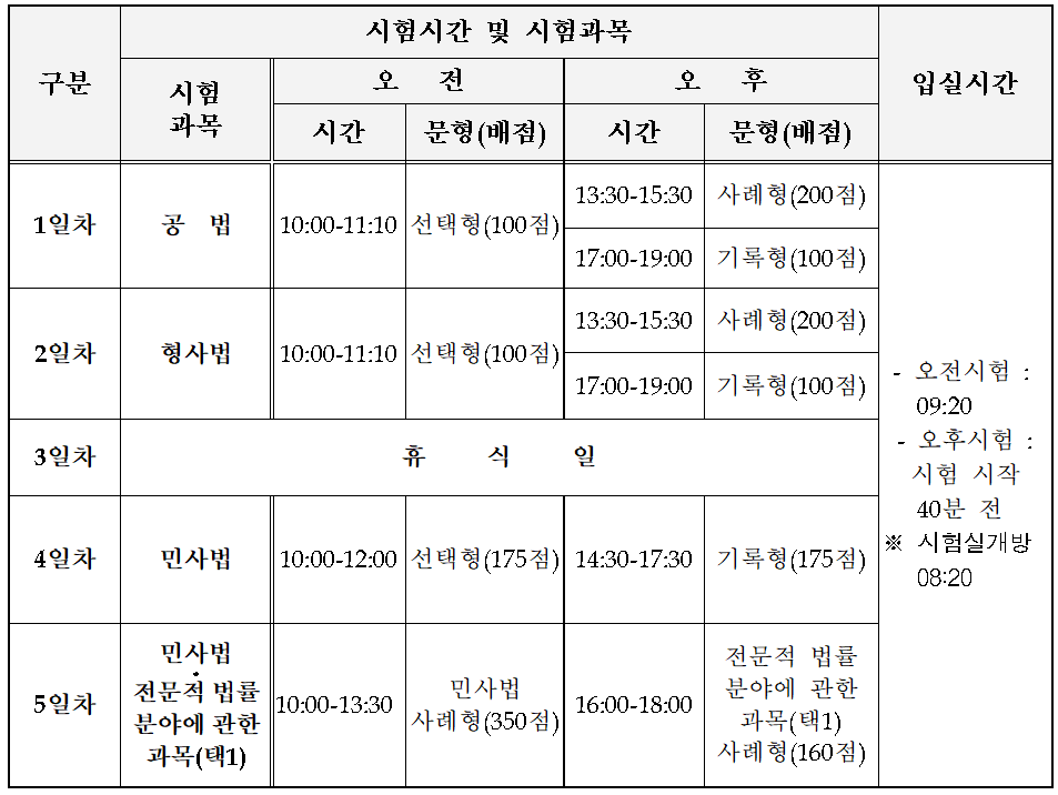 아래 시간표에 따라 공법, 형사법, 민사법은 선택형, 사례형, 기록형의 3가지 형식으로 출제되며, 선택과목은 사례형으로 출제됩니다.