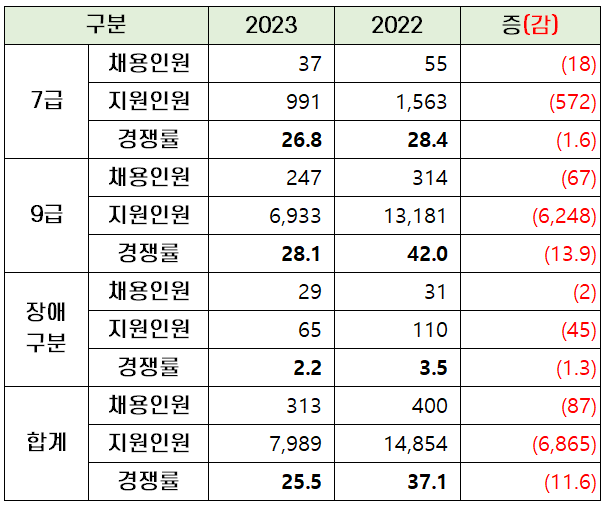 지난해 53명에서 13명이 감소한 40명을 선발하는 9급 행정 직렬은 2023년 지원자도 4,453명으로 지난해 8,895명에서 크게 감소했는데요. 경쟁률도 167.8대 이에서 111.3대 1로 하락했습니다.