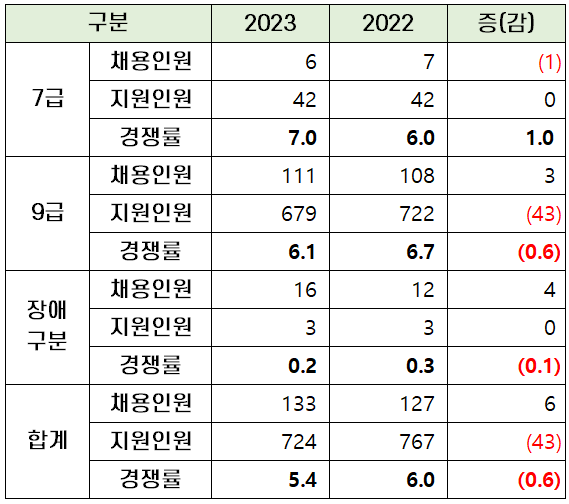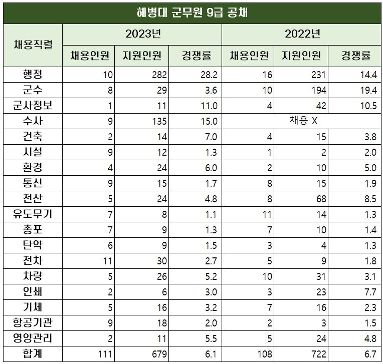 2023년 해병대가 주관하는 일반군무원 공개경쟁 채용 현황 및 경쟁률을 요약정리하고 2022년 경쟁률과 비교하면 아래 표와 같습니다.