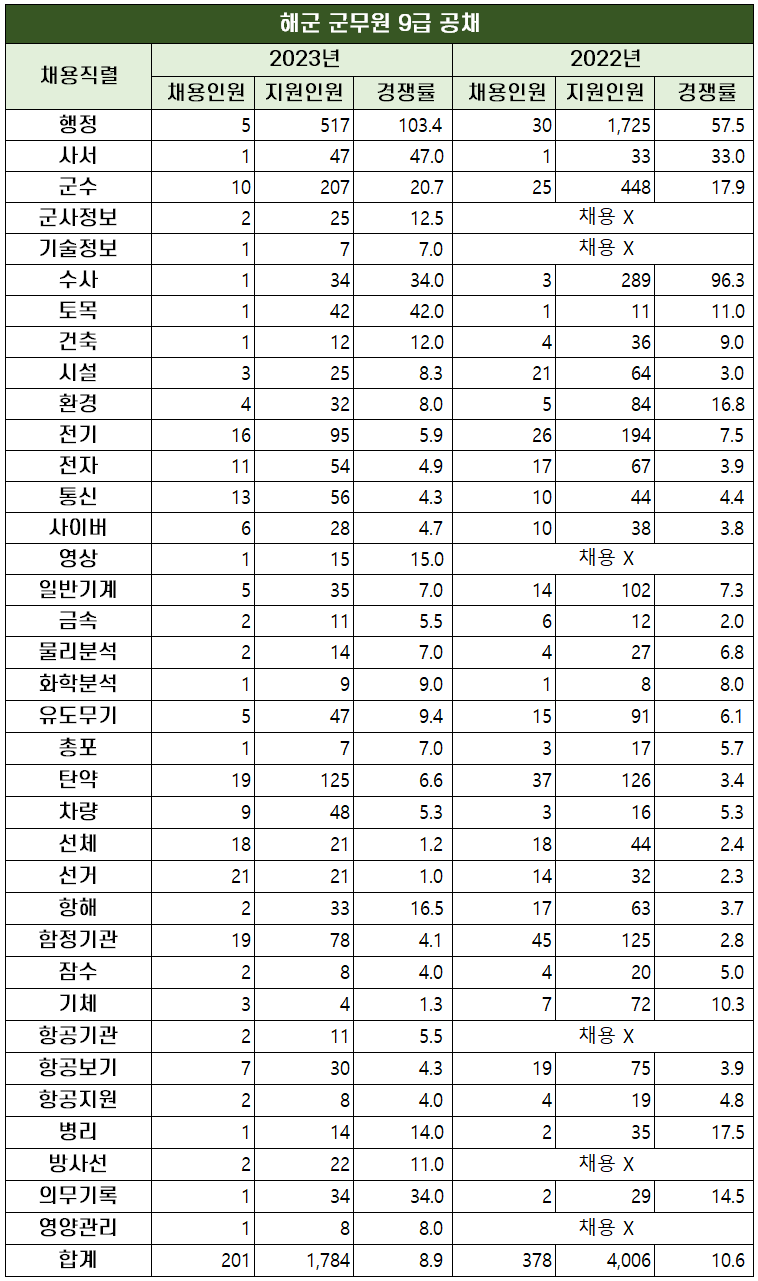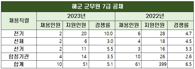 2023년 해군 군무원은 259명을 선발하는데 1,843명이 원서접수를 해 7.1대 1의 경쟁률을 기록했는데요. 지난해보다 채용 인원 축소와 함께 지원자도 크게 감소하면서 경쟁률이 하락했습니다.