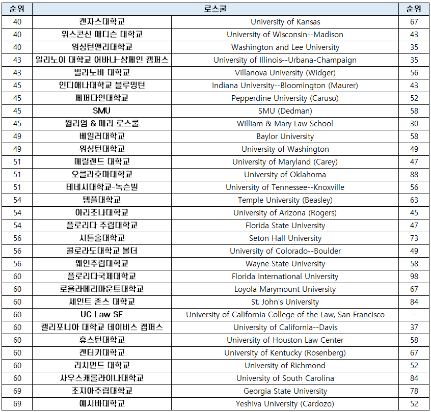40위 이하에서 가장 큰 폭의 순위 상승을 포인 로스쿨은 플로리다국제대학교(Florida International University) 로스쿨로 98위에서 60위로 38단계나 순위가 상승했고, 오클라호마대학교(University of Oklahoma) 로스쿨도 88위에서 51위로 순위가 37단계 상승했습니다.