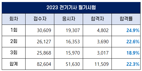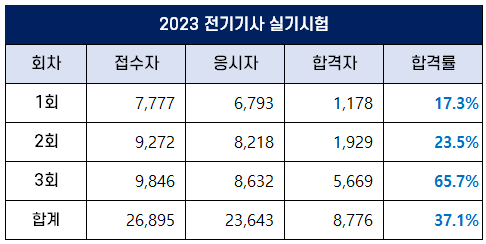 3회 전기기사 필기 시험은 15,970명의 응시자 중 3,017명이 합격해 18.9%로 2023년 시행된 시험 중 가장 낮은 합격률을 기록했습니다.