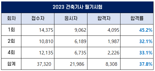 4회 건축기사 필기 합격률은 33.1%이며 2023년 평균 합격률은 37.8%입니다.