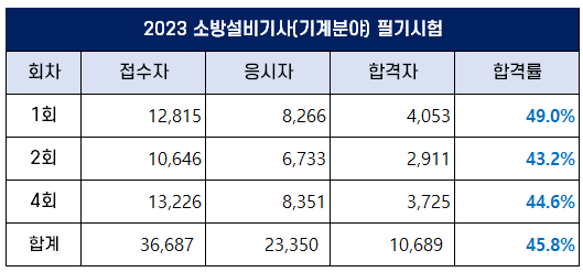 4회 소방설비기사 기계분야 필기 합격률은 44.6%이며, 2023년 평균 합격률은 45.8%입니다.