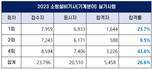 4회 소방설비기사 기계분야 실기 합격률은 43.6%이고, 2024년 평균 합격률은 26.6%입니다.