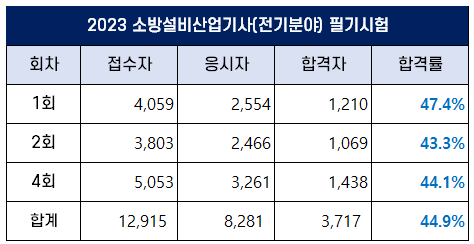 4회 소방설비산업기사 전기분야 필기 합격률은 44.1%이고, 2023년 평균 합격률은 44.9%입니다.